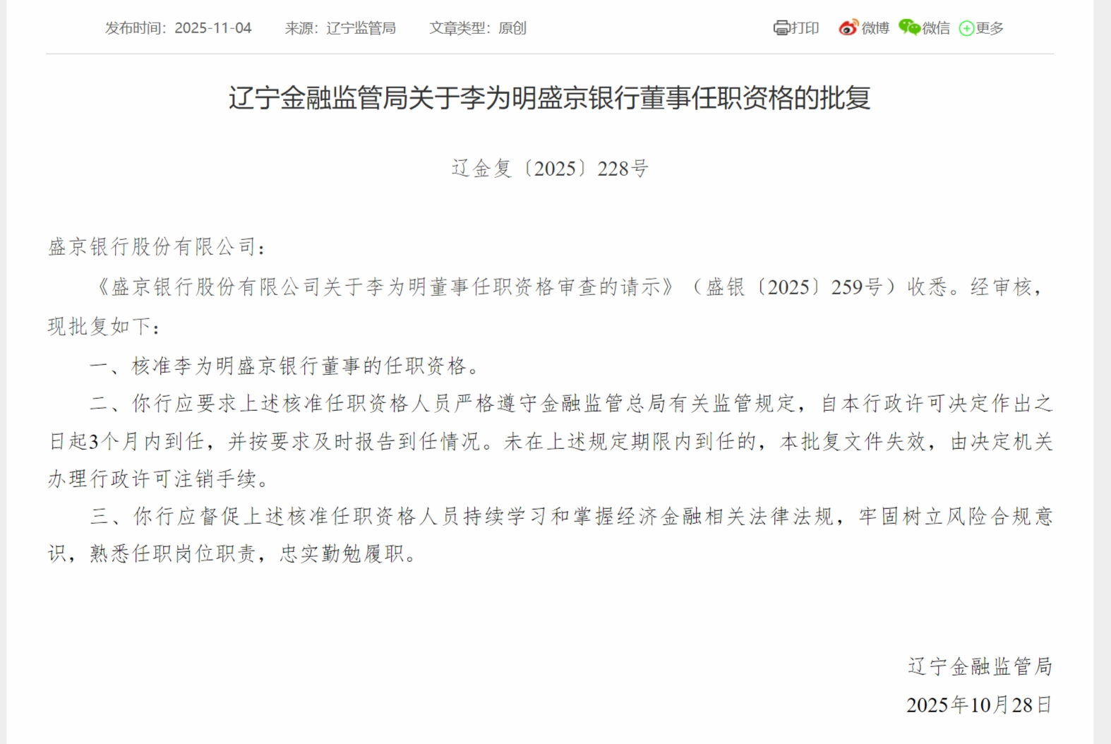 11月4日,辽宁金融监管局发布关于李为明盛京银行董事任职资格的批复,核准李为明盛京银行董事的任职资格。