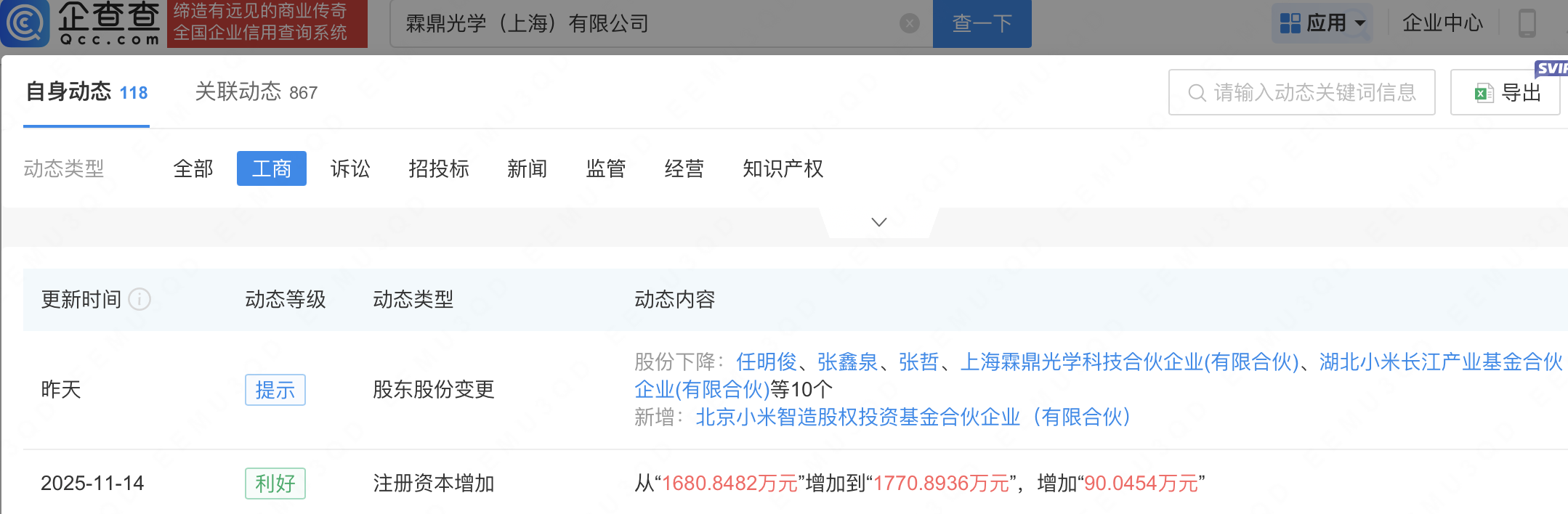 近日,霖鼎光学(上海)有限公司发生工商变更,新增北京小米智造股权投资基金合伙企业(有限合伙)为股东,持股5.08%,同时注册资本增至1770.89万元。企查查信息显示,该公司成立于2019年,法定代表人为任明俊,经营范围包含:电子测量仪器制造;光学仪器制造;光学仪器销售;光学玻璃制造等,湖北小米长江产业基金合伙企业(有限合伙)对其持有9.11%股份。据其官网,霖鼎光学专注于超精密技术研发和光学智能制造。